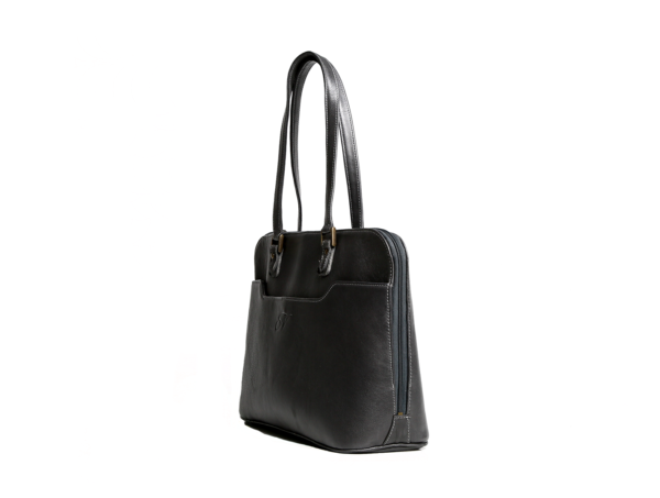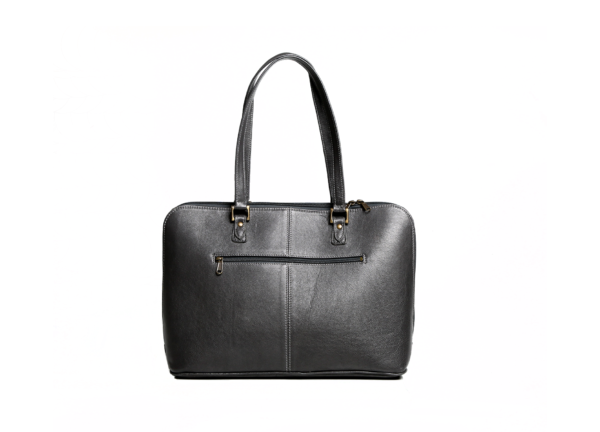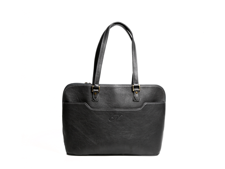 GENUINE LEATHER Laptop Bag. W395mm x H290mm x D135mm. Double handle domed zip closure outer slip pocket on the front outer zip pocket two large compartments middle compartment to hold a 15″ laptop one zip pocket one long slip pocket business card slip pocket cell phone slip pocket-with antique brass fittings.