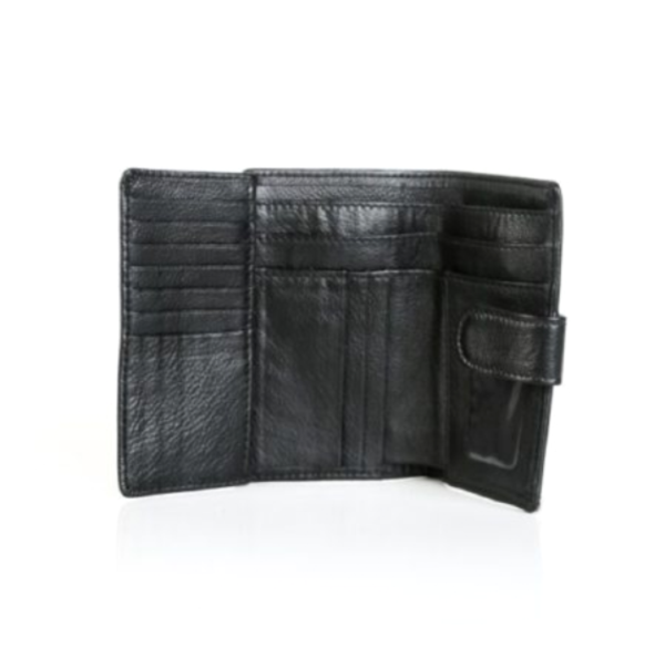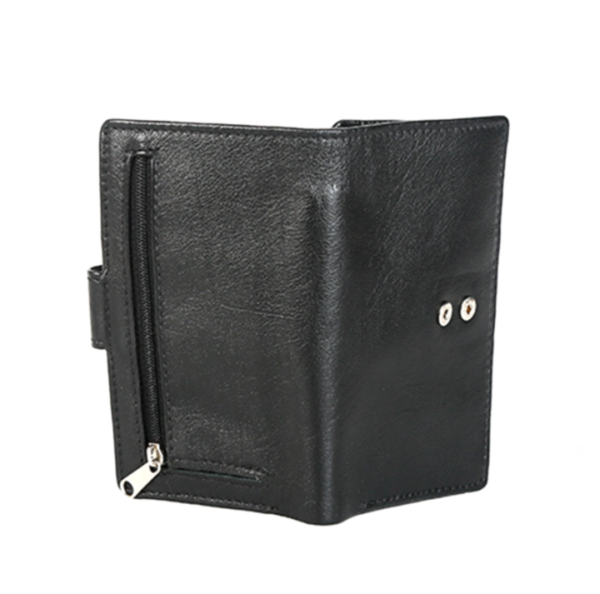 Three Fold Ladies Purse with a closing clip and Zip coin Pouch on the Back. Suede Inner